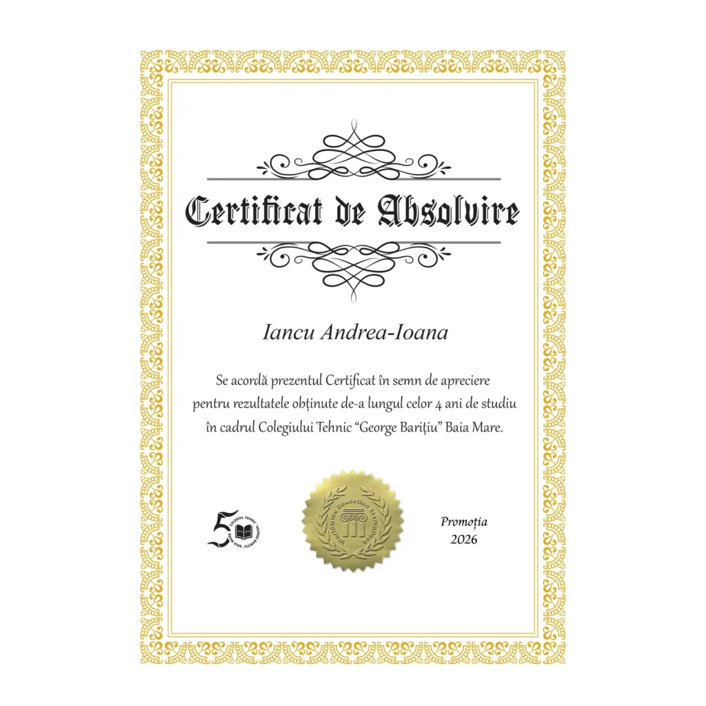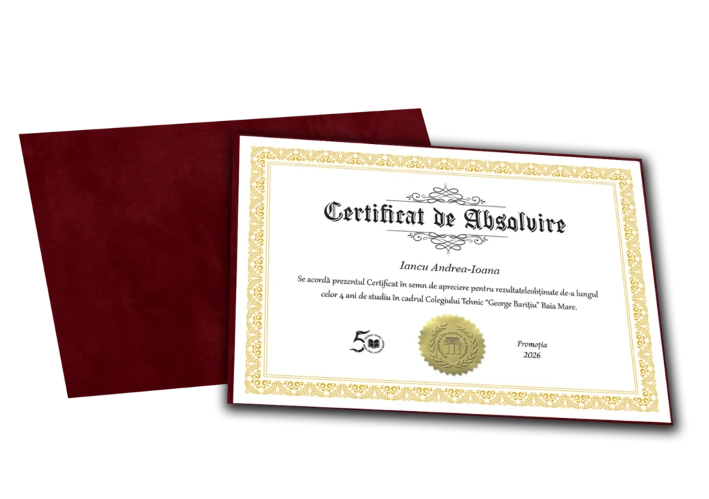 Certificatul de absolvire a îmbrăcat haine noi. Acesta este format din hârtie de culoare crem la care se adaugă ramă folio de jur împrejur. Pe lângă caracteristica de unicitate, aplicarea și embosarea etichetelor aurii conferă certificatului un aspect elegant deosebit.